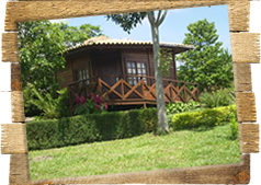 Chalé Master: 01 cama de Casal, 01 Cama de Solteiro, TV 32” LCD com SKY, Frigobar, Ar Condicionado, Varanda em Deck, Estacionamento Privativo, Segurança e Portão Eletrônico.